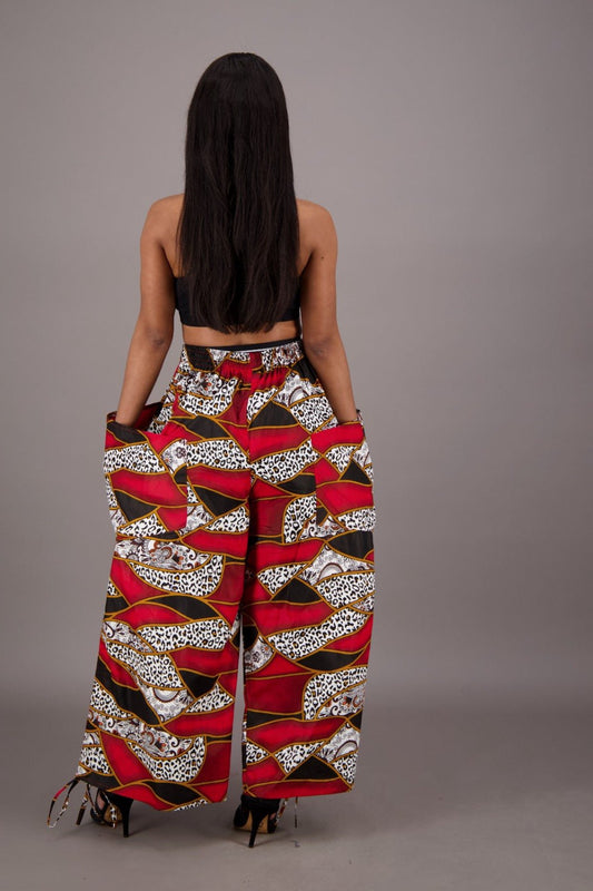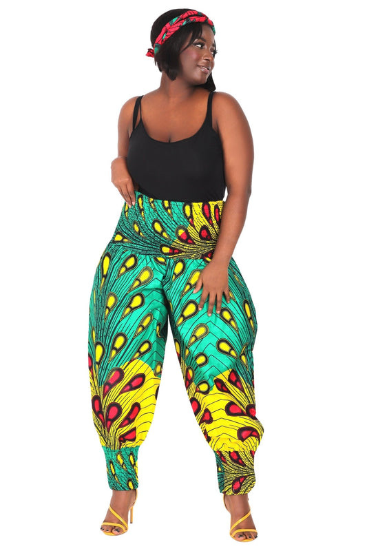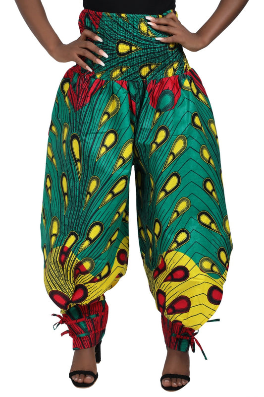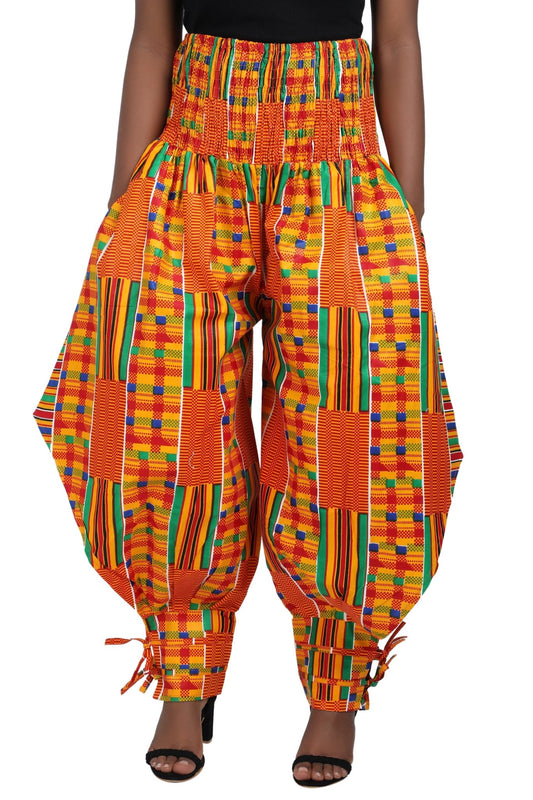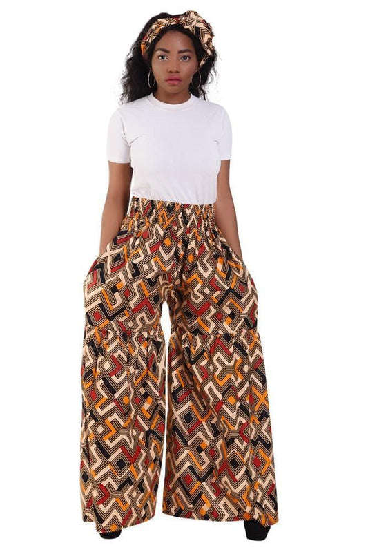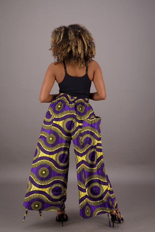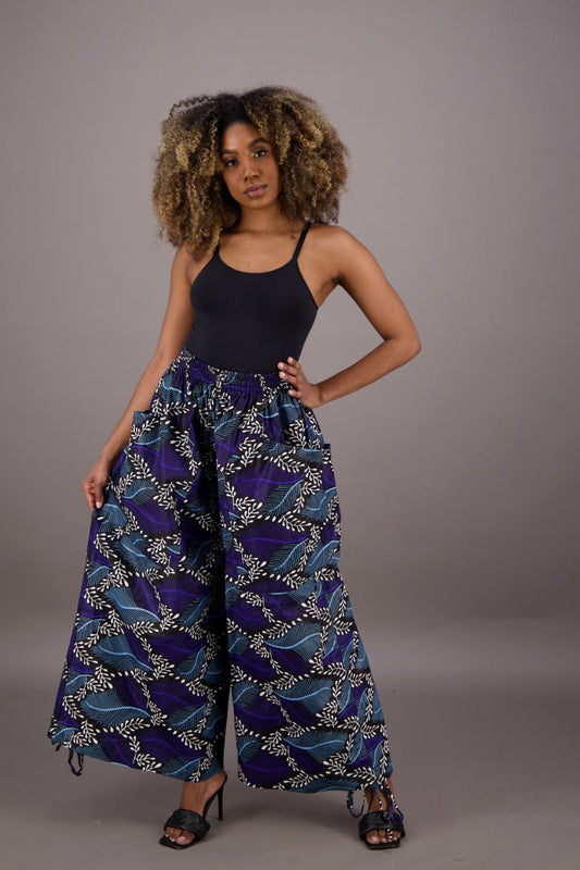 Our Ankara pants are made with 100% cotton fabric that is versatile, comfortable and stylish. These Ankara-style pants have wide legs and comfortable elastic waistbands, the perfect comfortable and unforgettable addition to any collection of West African clothing.Unique, brightly colored, and comfortable, these pants will match wonderfully with many fashion styles and African outfits. For those of you looking for a foolproof way to pair up these African Palazzo pants, try matching them to one of our solid-color wax print blouses for a dazzling look. Play around with the patterns to create an image that you can own!
