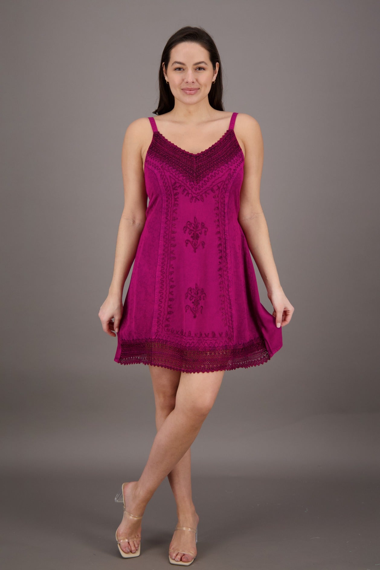 A mid-length, double-dyed dress with a narrow straps. A unique arrangement of complimentary fabrics, laces and embroidery details work in harmony to create a high-fashion look.