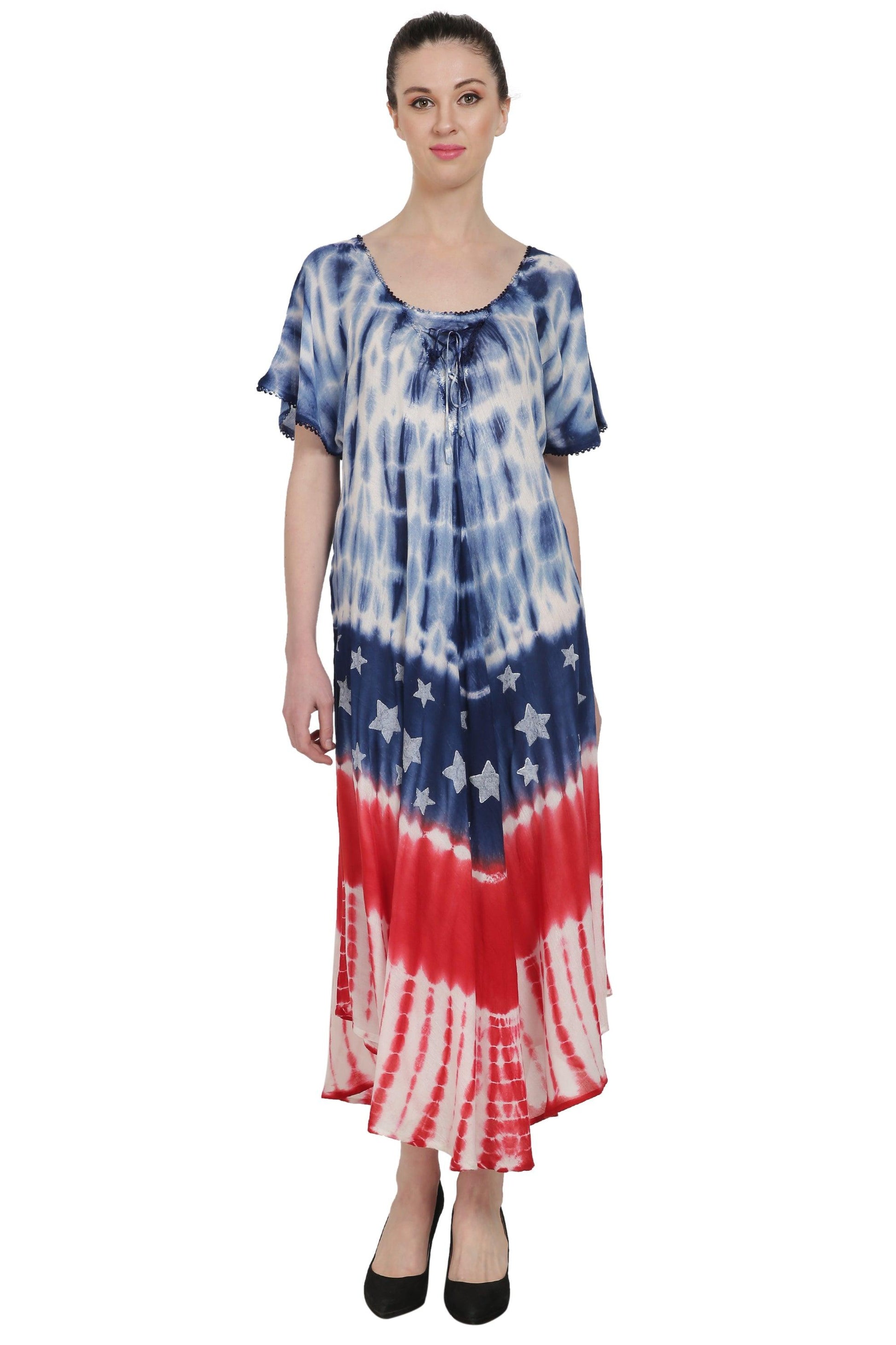 | An ankle-length, scoop-neck dress with short flared sleeves and a tie-front accent. The patriotic tie-dyed print is inspired by the unity and liberty for all in the USA. |